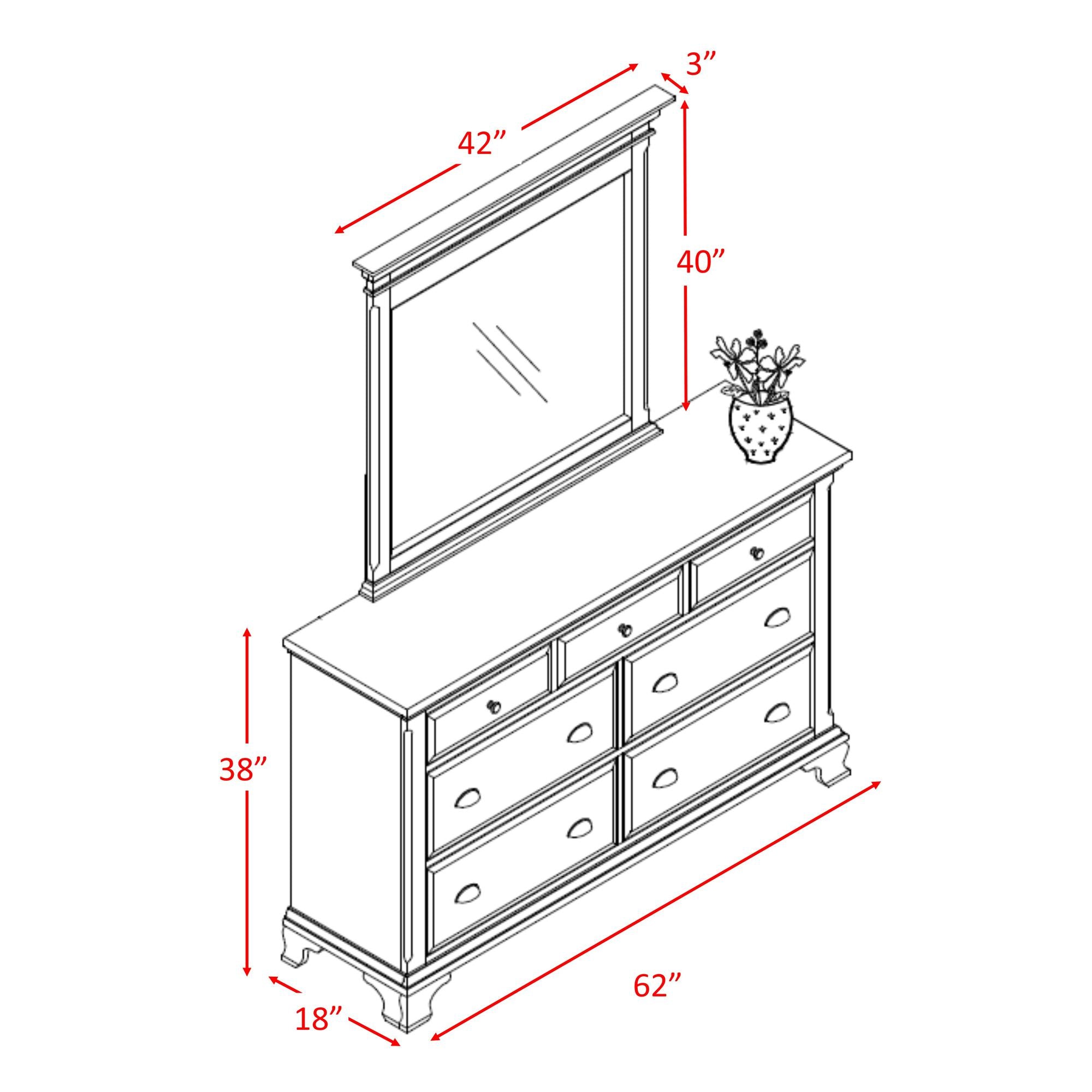 The Canton Dresser & Mirror Set features sensuous curves and sleek lines. This seven-drawer triple dresser is the ideal addition to your master bedroom. Plus, the 42" beveled mirror makes an exquisite addition with its thick molding. - Beautiful Cherry finish - Drawers feature full extension metal side glides with built in stops. Dust proofing on bottom drawers for added protection - Features seven drawers for ample storage space. Top drawers are felt lined - Antique pewter look pulls and knobs - 4mm thick beveled mirror Pine solids with Cherry veneers 20 D x 62 W x 78 H, 183lbs. 1 Year Limited Manufacturer Warranty