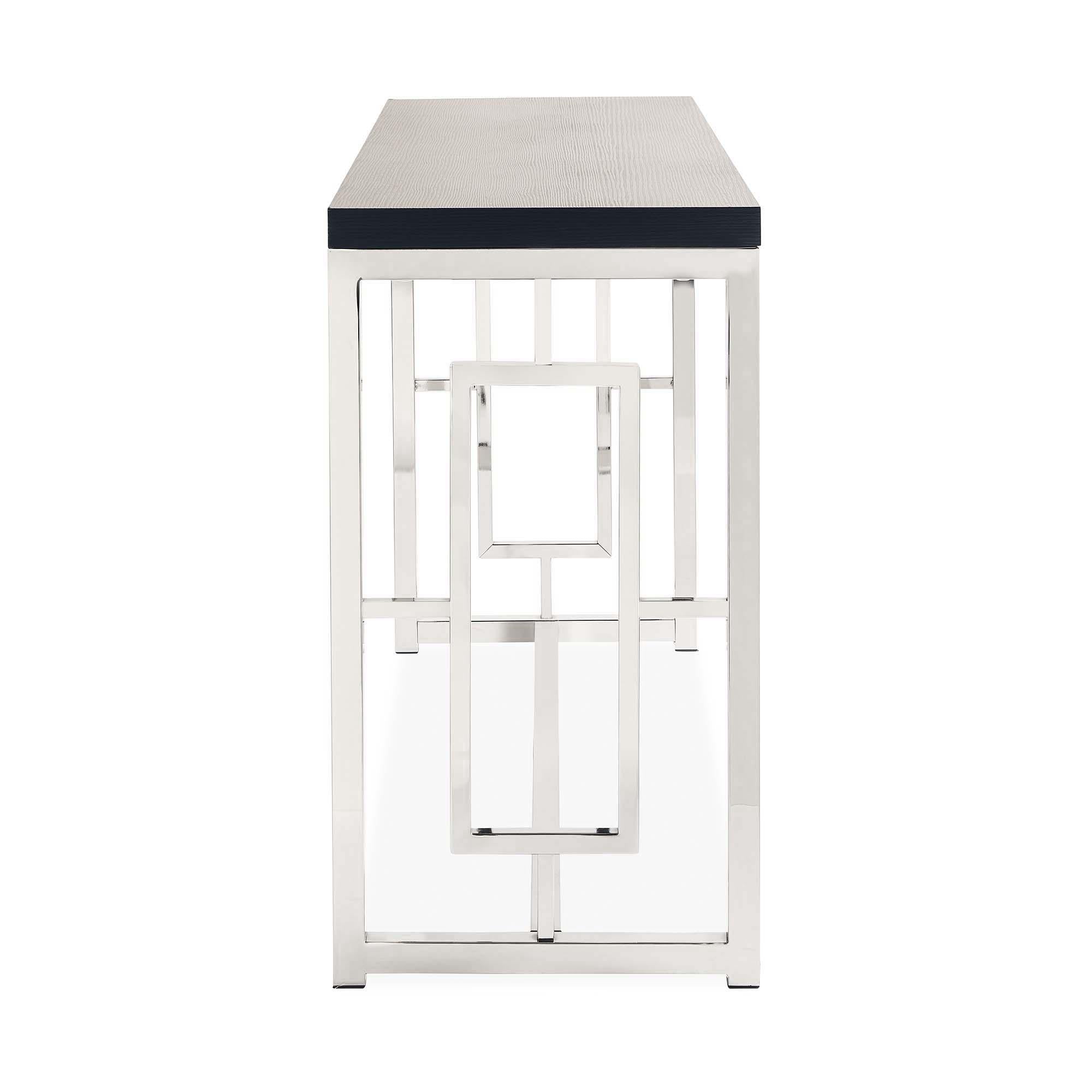 The Ezra Sofa Table is modern glam at its best! This rectangular table will look great behind the sofa, or even in an entryway. This table features a black table top that pairs beautifully with the chrome finish and will also pair with any existing decor and furnishings you already have. The sides of the sofa table feature an intricate design adding extra flair to this already stylish accent table. Adding this accent staple piece to your home will instantly add style and glam, a look youll never get tired of. - Rectangle Sofa Table - Chrome Finish - Black Table Top - Intricate Design on Outer Legs - Modern Glam Design - Stretcher Base Particle Board Metal 16 D x 48 W x 29 H, 37lbs. 1 Year Limited Manufacturer Warranty