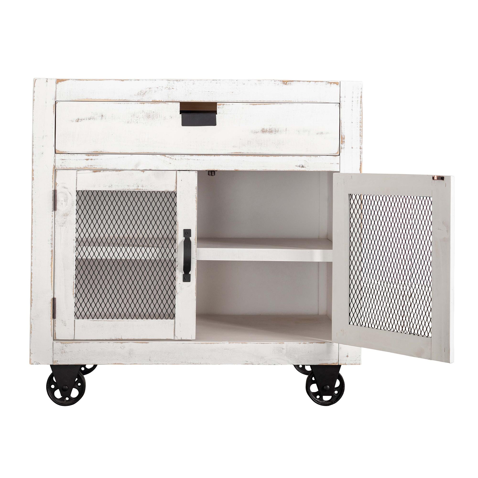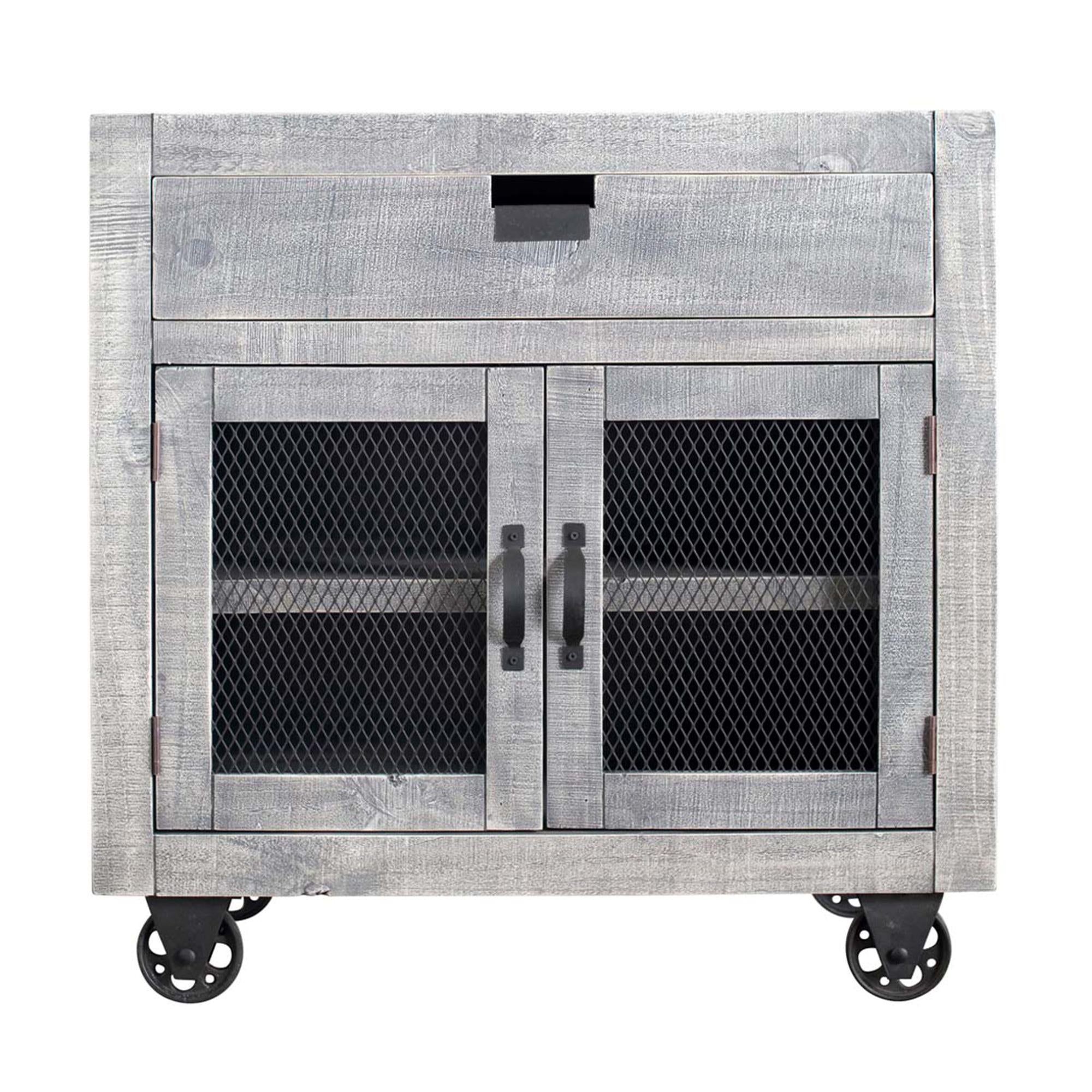 The Industrial 2-Door Accent Chest will look stunning in your home! This chest features chicken wire front doors, perfecting the rustic look and vibe. The accent chest offers one spacious drawer to easily store away belongings and keep them out of sight. The caster wheels make it easy to display this piece anywhere you please, like even your bedroom as a nightstand. Brazilian pine wood and a hand painted, distressed finish will make this piece a standout year after year.