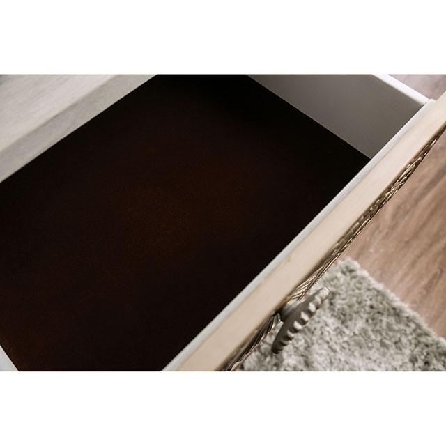 JAKARTA Cal.King Bed, 93 1/2"L X 81 1/2"W X 62 1/4"H, 212.34lbs. An elaborate floral design gives the pieces of the Jakarta Bedroom Collection a cohesive look for a relaxing, sophisticated master suite or well-appointed guest room. The bed features a luxurious padded headboard and sturdy frame, while the night stand, dresser, and chests offer plenty of storage, English dovetail constructed-drawers, felt-lined top drawers, ball-bearing glides, and even a USB charger integrated into the night stand. An antique white finish and turned legs complete the transitional look.