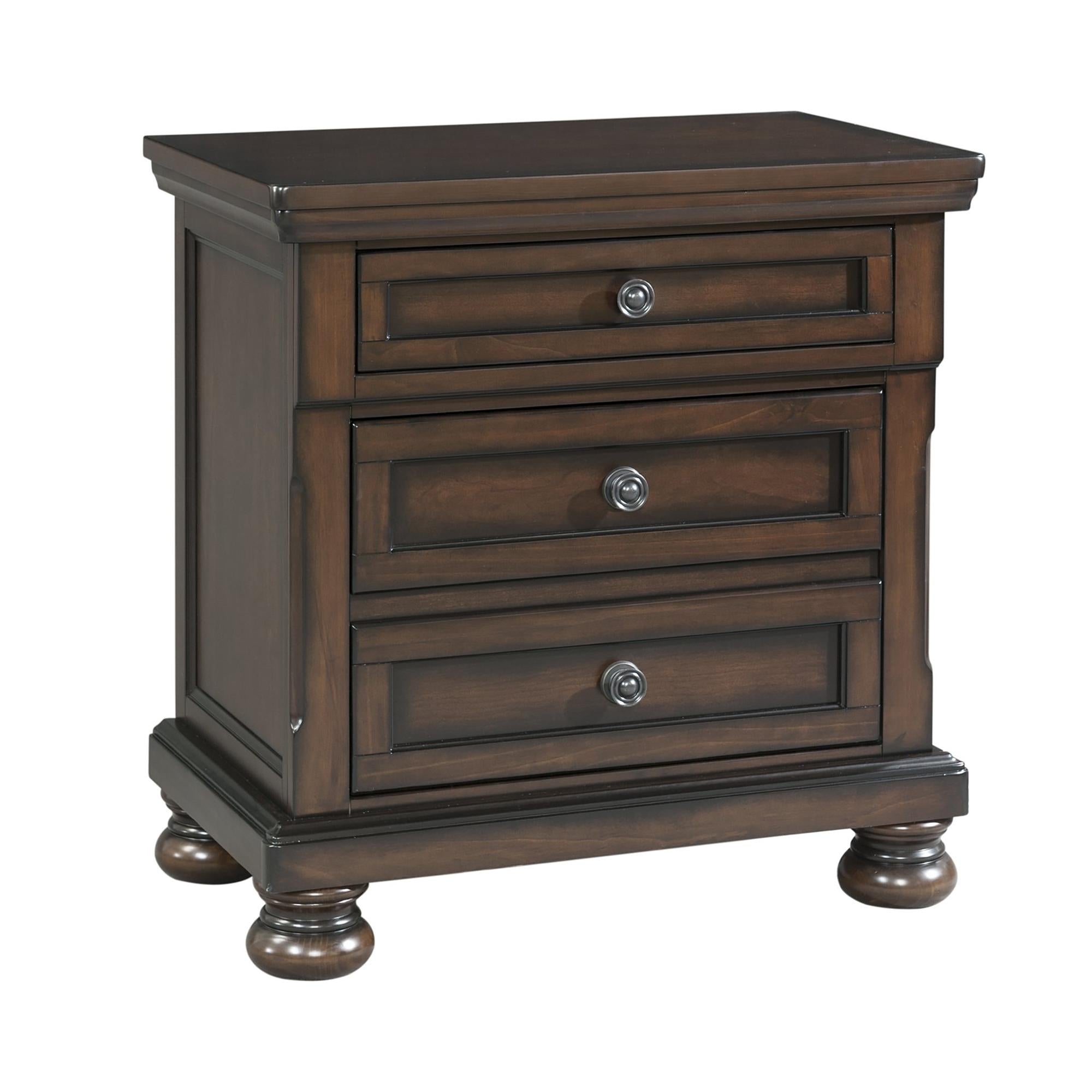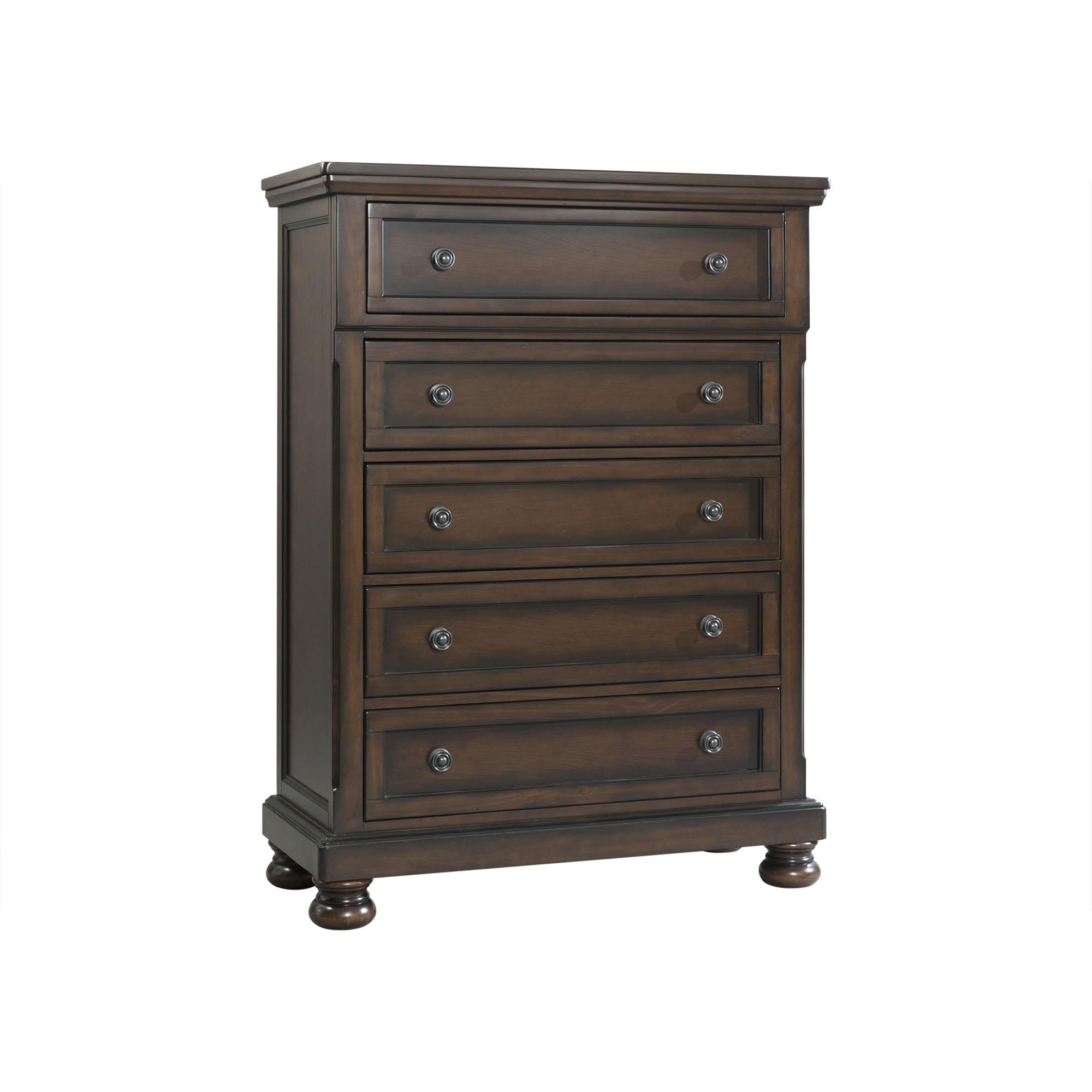 The Kingston 5-Drawer Chest is the perfect addition to your bedroom! This vertical chest comes with five, spacious drawers and one hidden drawer; perfect for neatly storing away your belongings. The top drawer is felt-lined, protecting your more valuable belongings. Raised panels and dark silver drawer knobs complete the fronts of the drawers. This chest of drawers in finished in a warm walnut wit a cherry veneer, making this traditional piece a staple in your home year after year. Clean lines and bevel edges are present throughout, while the bun feet complete the look of this spectacular piece. - Bun Feet - 5 Spacious Drawers - Bevel Edge - Felt Lined Top Drawer - Anti-Tipping Pinewood; Plywood; MDF w. Cherry Veneer; Dark Metal Finish Knobs 18 D x 40 W x 54 H, 132lbs. 1 Year Limited Manufacturer Warranty