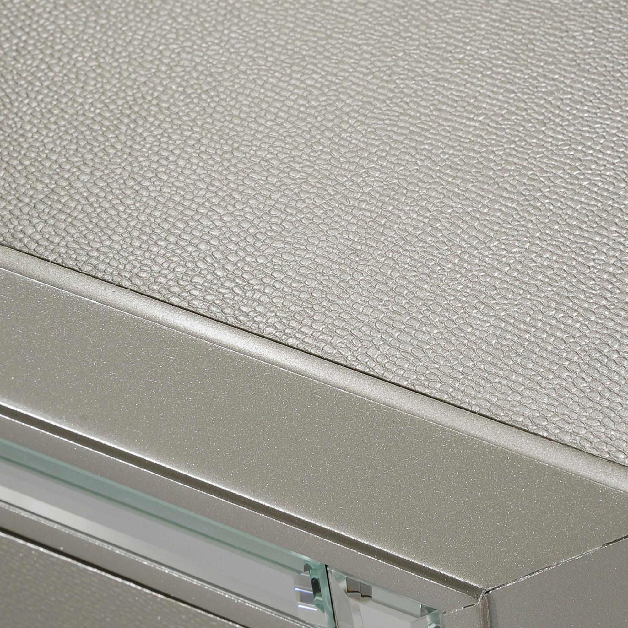 The Platinum Youth Chest is sure to delight your glamour queen! This chest of drawers comes with five spacious, perfect for keeping all of your belongings neatly stored away. This vertical chest features a mirror glass trim along the front, while the chrome drawer handles feature crystal-like accents. This chest comes in a chic, champagne color adding instant glamour to your little ones bedroom. Sleek, clean lines with bracket feet complete the look of this glamorous chest. - Chic Champagne Finish - Glamourous Chrome Handles With Crystal Accents - Mirror Glass Trim - Stylish Bracket Feet Solid Wood and Plywood Framing; Engineered Wood; Metal Handles; Glass Mirror Detail Trim 17 D x 36 W x 52 H, 116lbs. 1 Year Limited Manufacturer Warranty
