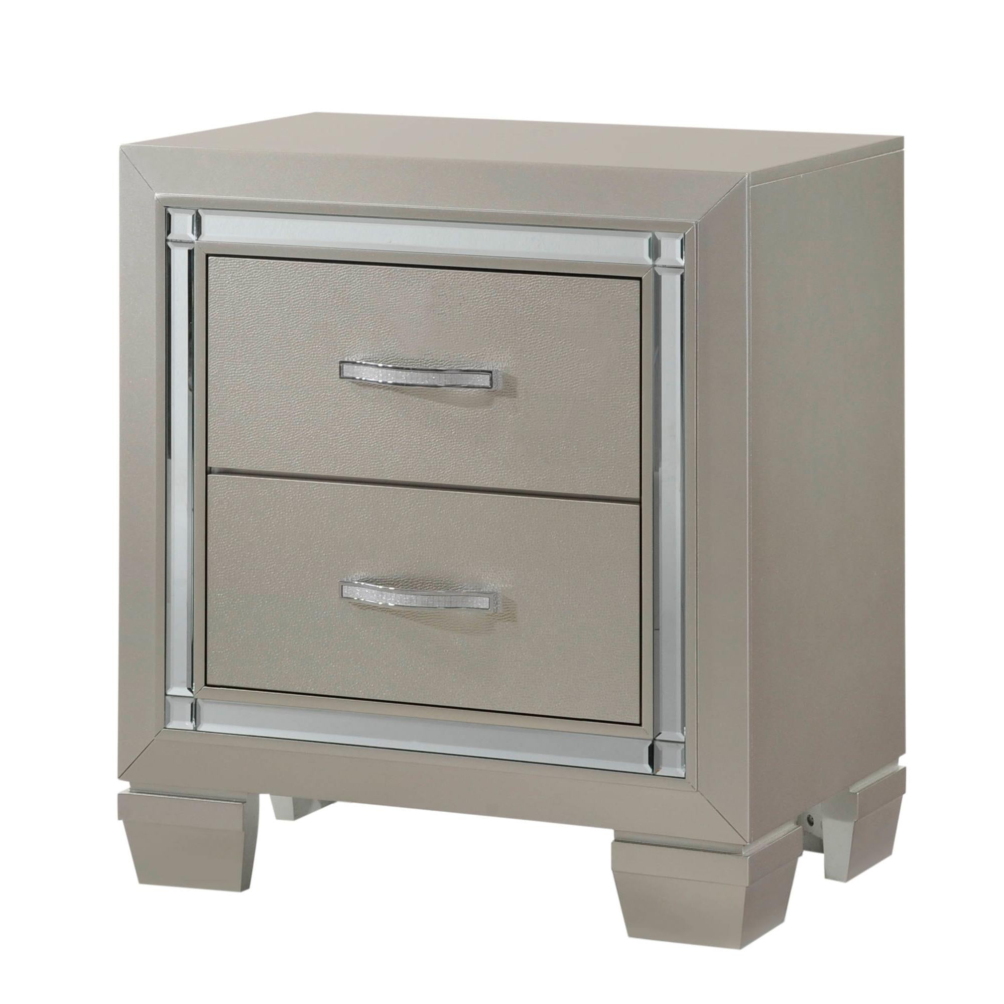 The Platinum Youth Nightstand is sure to delight your glamour queen. This nightstand has a mirror glass trim and comes in a chic champagne finish. Two drawers for storage complete this nightstand. - Chic Champagne Finish - Glamourous Chrome Handles With Crystal Accents - Mirror Glass Trim - Stylish Bracket Feet Solid Wood and Plywood Framing; Engineered Wood; Metal Handles; Glass Mirror Detail Trim 16 D x 24 W x 26 H, 40lbs. 1 Year Limited Manufacturer Warranty