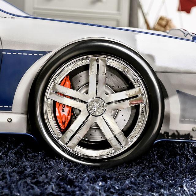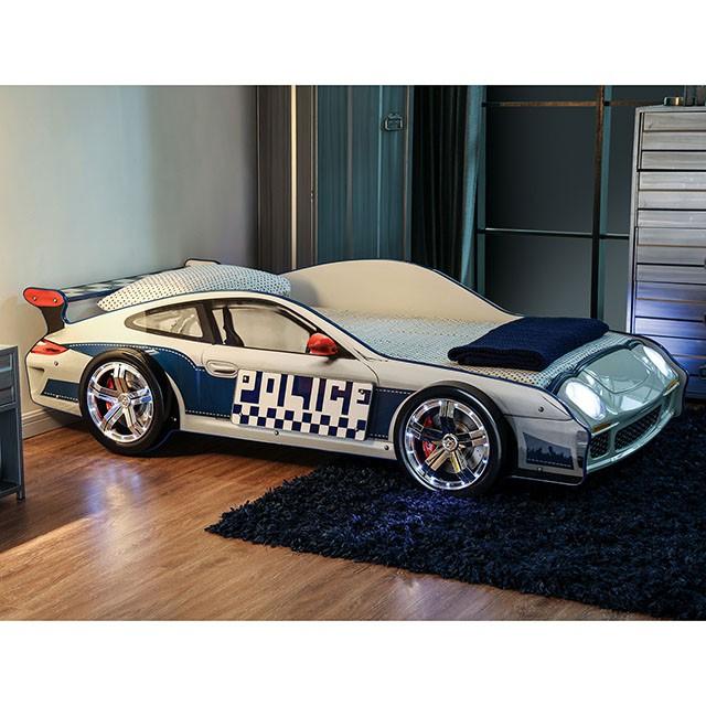 Twin Bed Height: 25.00" Width: 45.50" Length: 90.00" Hero on patrol! Your child will race off into dreamland adventures with this turbo squad car bed design. It’s flashy and sturdy, complete with metal supports, working lights and a shiny finish.