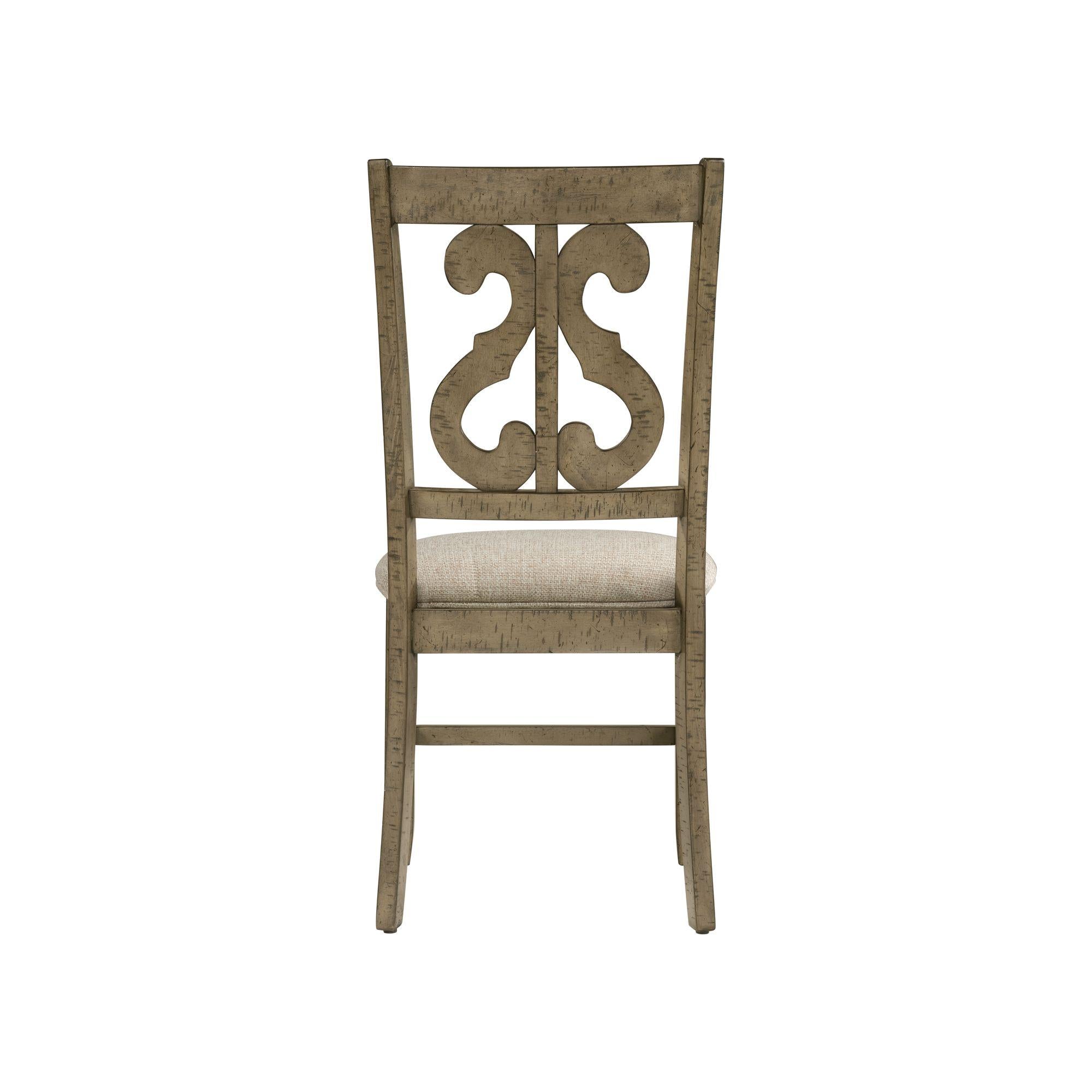 The Stone Wooden Swirl Back Side Chair Set will be the new standout in your dining room! The back of this chair features an intricate, open-swirl back design, making this duo the reason you update your dining room. The seat is upholstered in a dark taupe and is filled with foam cushion to make for a comfy seat while sitting through long dinners. Detailed piping is featured along the edges of the seat, adding an extra element of design. The back and legs of the chair are finished in a smokey walnut and feature distressed makings throughout. The base of the chair has three stretchers, offering long lasting durability for many years to come.