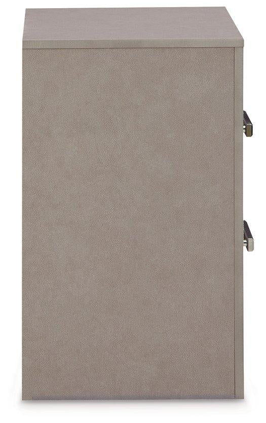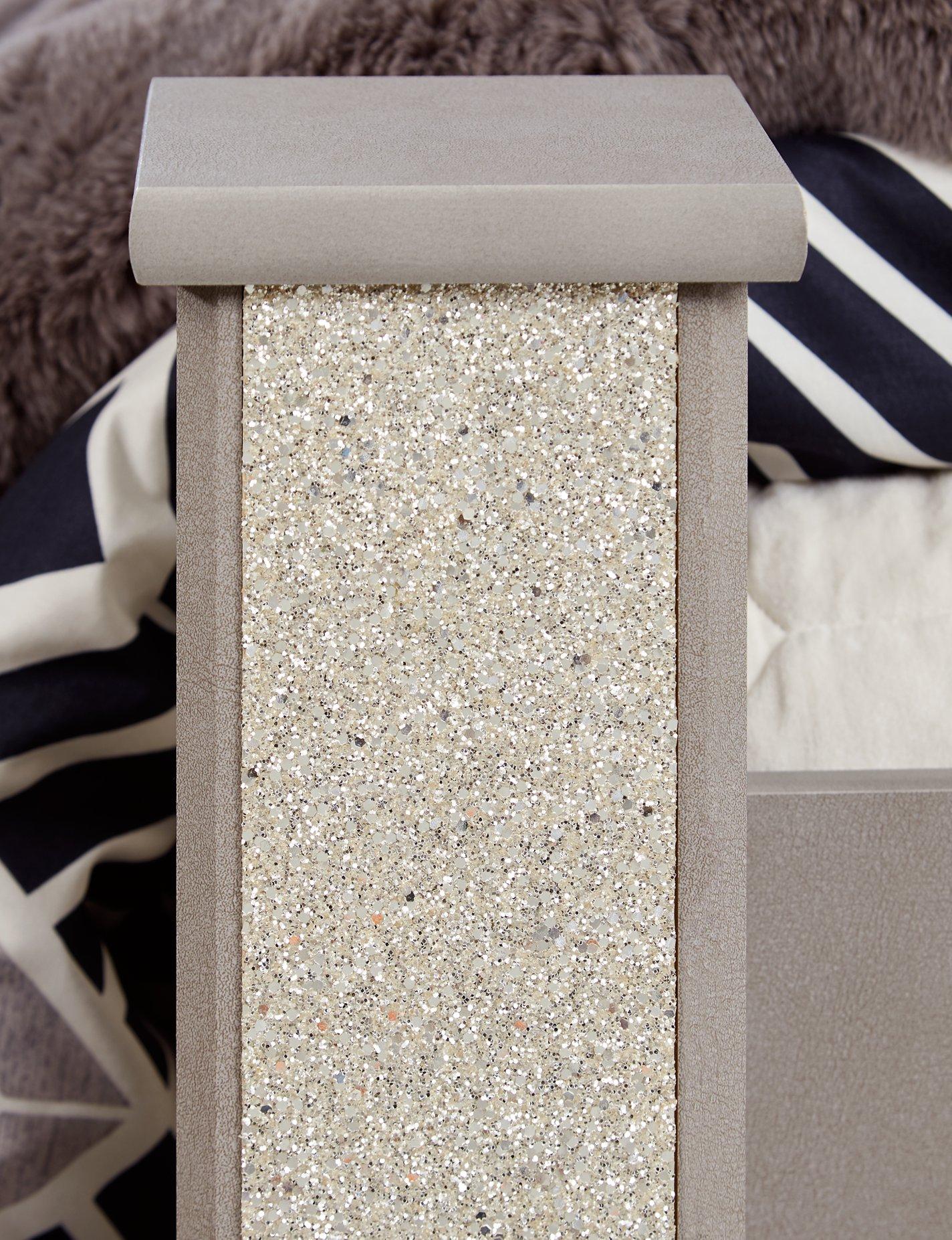 Love sleek and bold contemporary style? Drink in the beauty of this bedroom package. Its eye-catching details include glam glitter accents and the look of leather grain with a subtle gray finish. Combined with the streamlined aesthetic, this set is a simply stunning way to achieve the bedroom of your dreams.