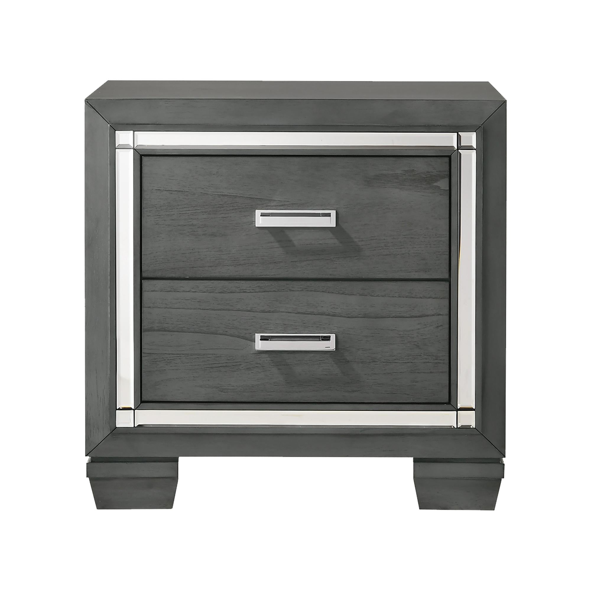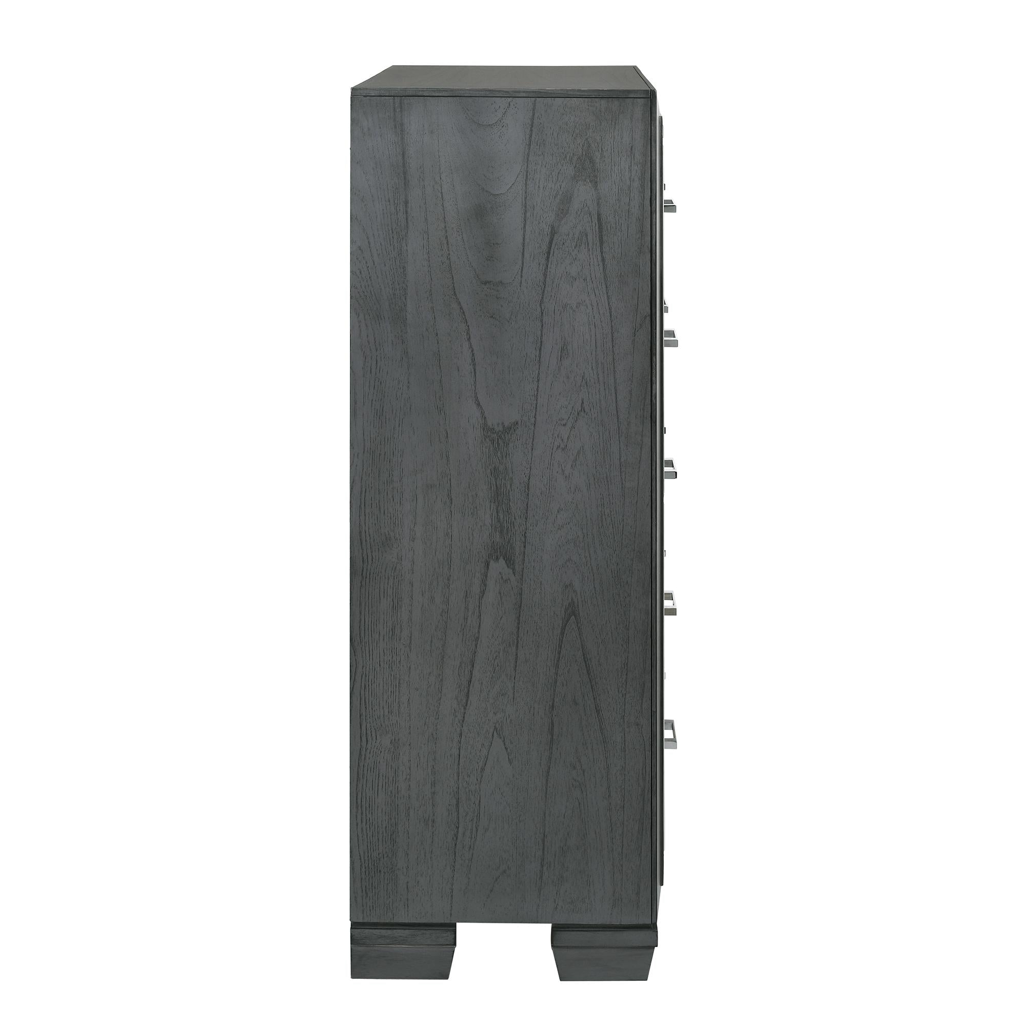 The Titanium 5-Drawer Chest is the perfect addition to your home! This bedroom chest offers plenty of storage space, with its five spacious drawers. The top drawer is felt-lined, protecting your more valuable items, while the bottom drawer features a dust proofing layer to help keep your belongings in tact. On the front of the chest, a mirror glass trim frames the chest; adding extra flair to this already stylish piece. The sleek, chrome handles pair perfectly with the trendy, gray finish. Bracket feet complete the look of this bedroom staple. - Five Spacious Drawers - Felt-Lined Top Drawer - Mirror Trim - Sleek, Chrome Handles - Bracket Feet - Dust Proofing Layer on Bottom Drawer - Anti-Tipping - Trendy Gray Finish Solid Wood/Plywood Wood Species: Rubberwood MDF w/ Mindy Veneer 18 D x 37 W x 53 H, 129lbs. 1 Year Limited Manufacturer Warranty