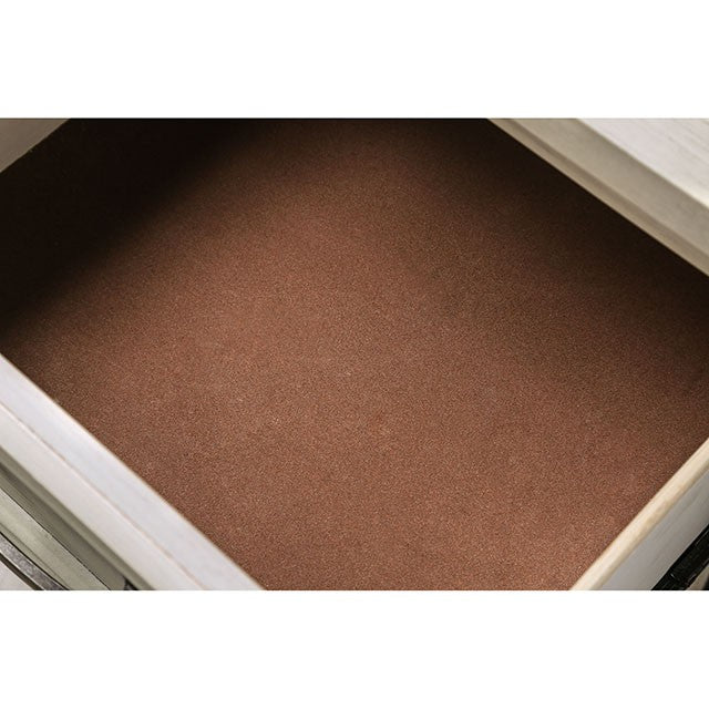 Tywyn Antique White Night Stand, 23 5/8"L X 15 3/4"W X 24"H, 49.5lbs. This highly versatile night stand will fit into almost any bedroom aesthetic. The weathered finish shows just enough wear without hampering the lovely wood grain on the drawer faces, which add a hit of natural shape. Antiqued drawer pulls add a quiet touch of class to the piece. Features: Antique Drawer Pulls Felt-lined Top Drawers Molded Trim Details Metal Bar Pull Drawer Hardware Felt Lined Top Drawer English Dovetail Drawer Construction Slat Kit Included