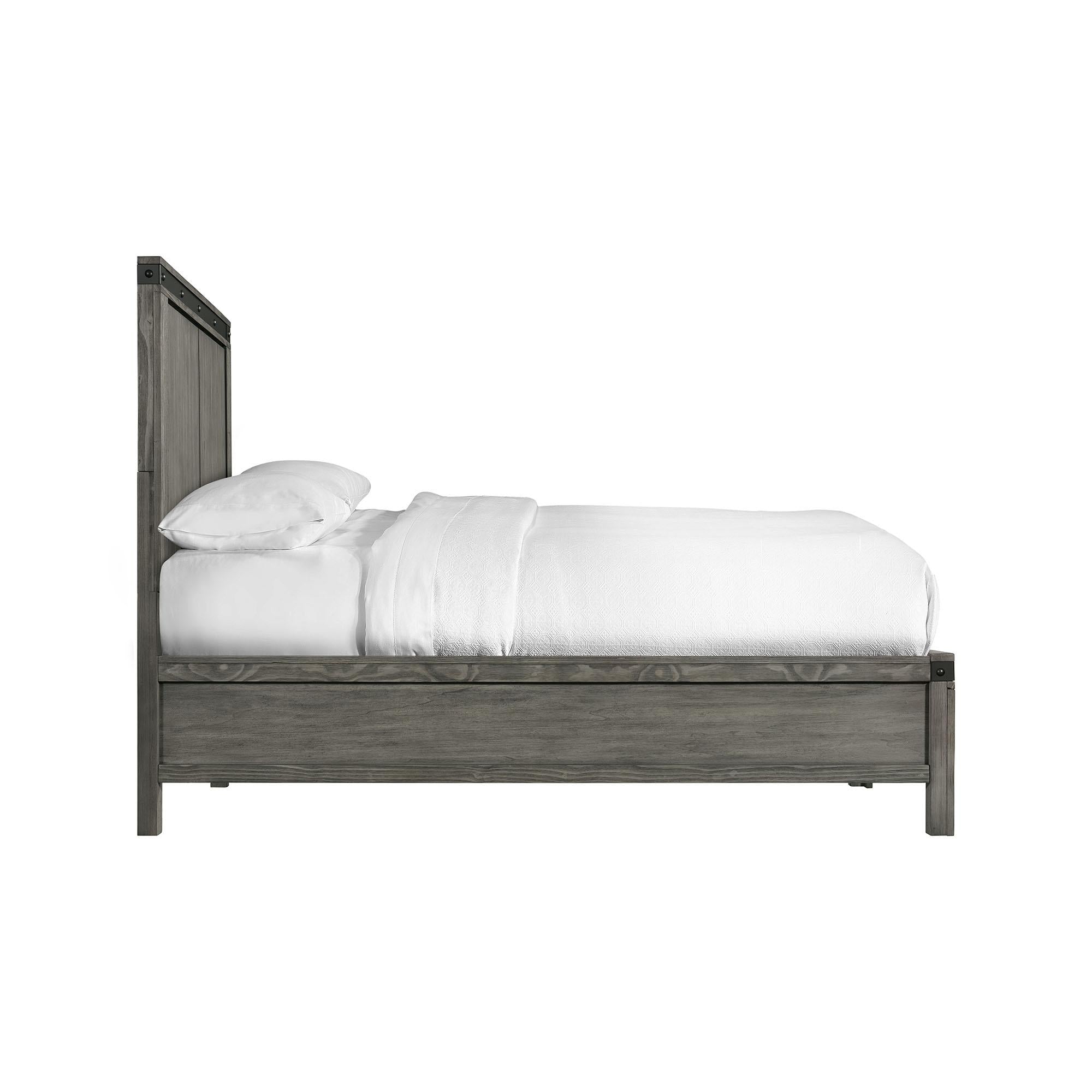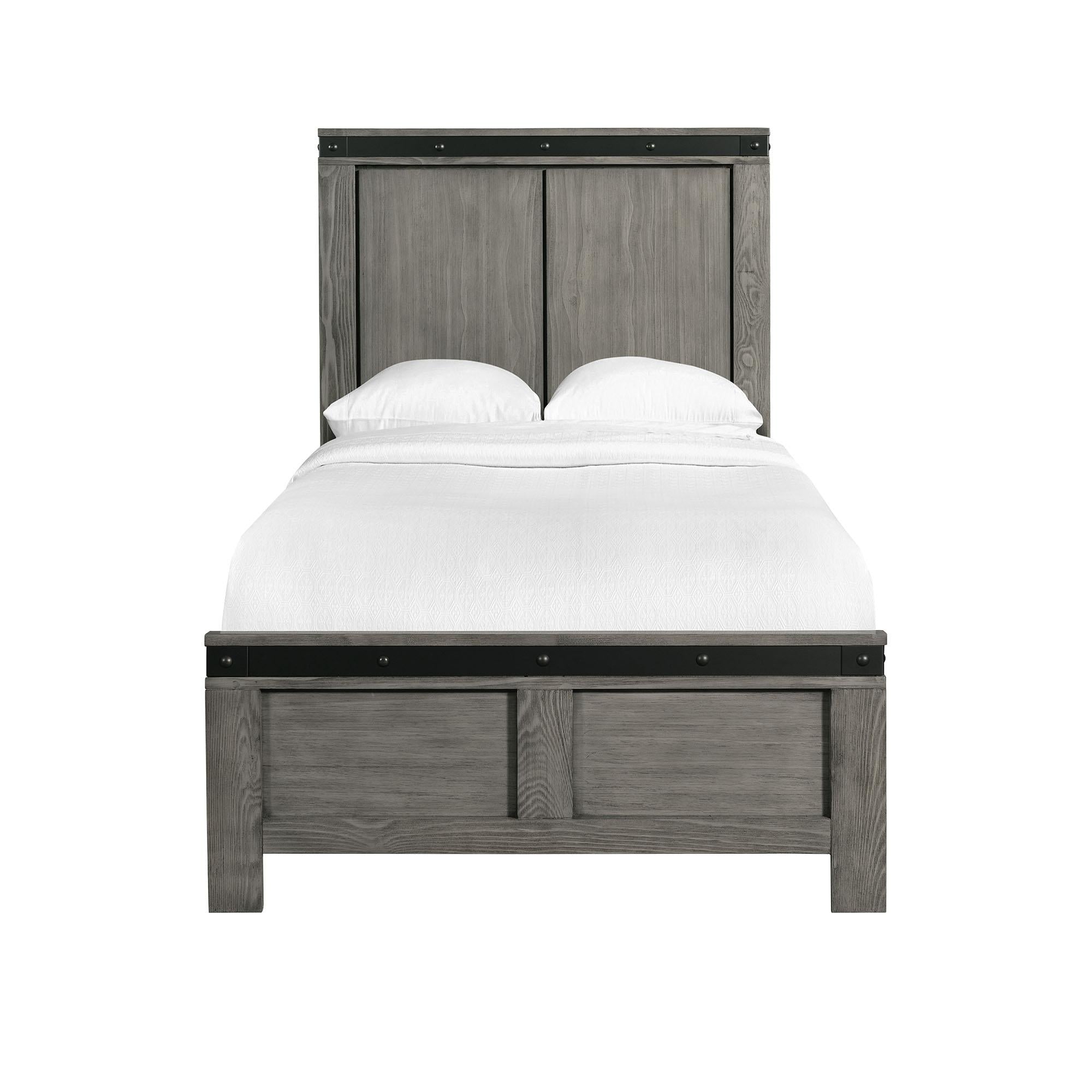 Wade Twin Panel Bed - Panel Bed - Black, Metal Trim along Front of Headboard and Footboard - Decorative Bolts along Black Metal Trim - Tri-Panel Headboard - Gray Finish - Transitional Style - Mattress and Box Spring Required Pine Solid Wood Plywood Particle Board MDF Butt Joint Construction Corner Blocked Reinforcements 80 D x 43 W x 57 H, 103lbs. 1 Year Limited Manufacturer Warranty
